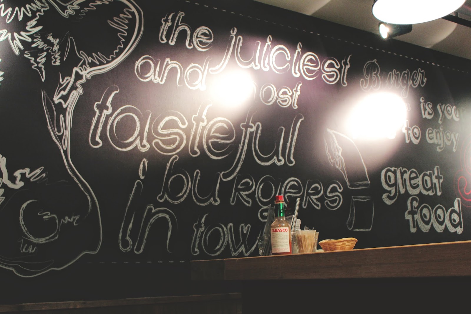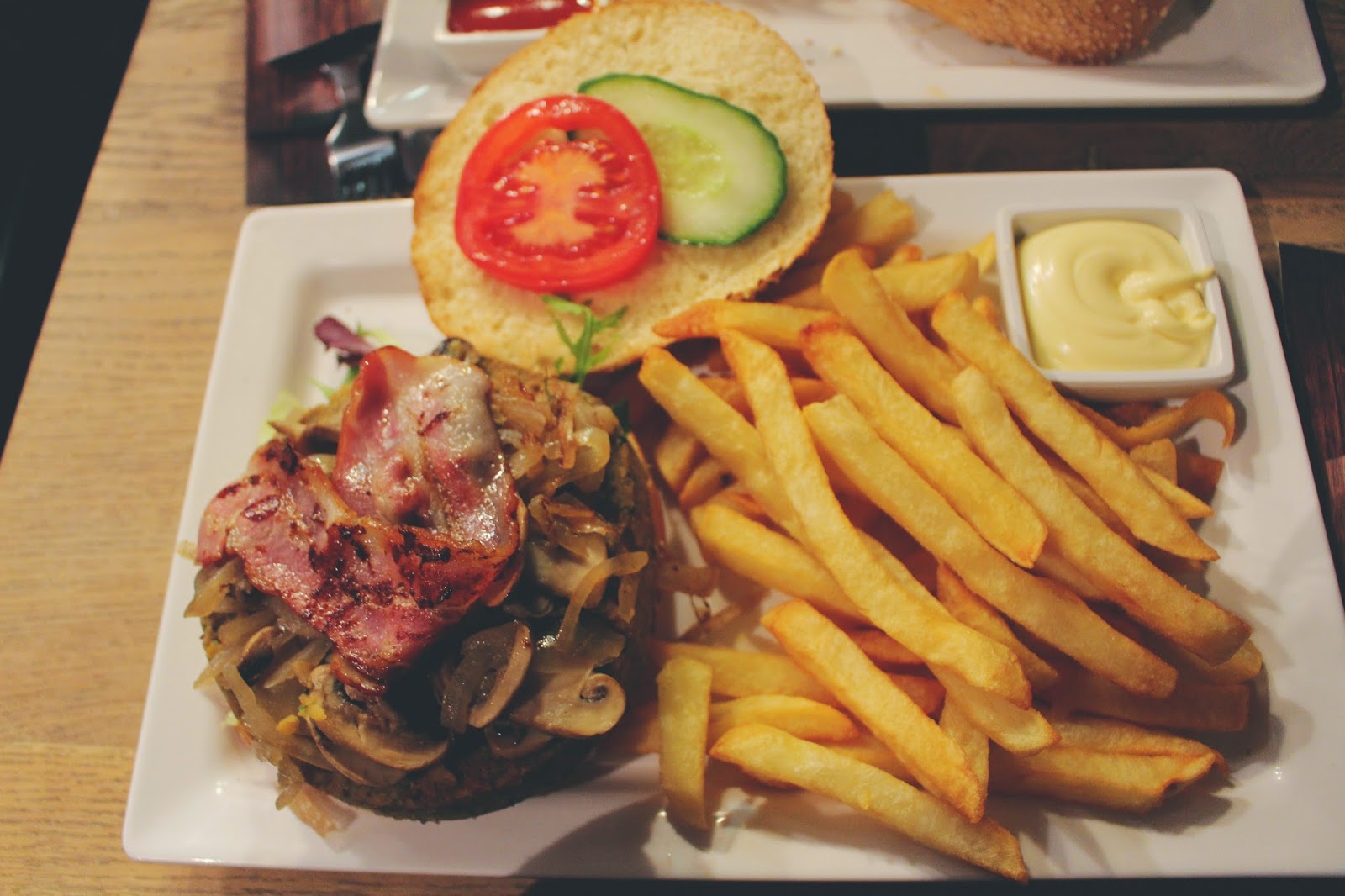 Vous pouvez composer votre burger vous même, choisir la viande (moi j'avais choisi le "steak" végétarien, parce que j'adore ça et aussi parce que c'était le moins cher), puis vous choisissez tous les accompagnements que vous voulez (j'ai choisi bacon, ouioui, bacon avec mon steak végétarien, la serveuse a bien ri haha, champignons, oignons) et ensuite vous choisissez des frites ou pas et une sauce ou pas. Cyrille et moi rêvions tellement d'y manger qu'on à craqué la belle assiette ! Personnellement, je n'ai pas su su manger toutes mes frites, alors qu'il faut y aller pour que je ne finisse pas mes frites haha - goulaffe bonjour -.