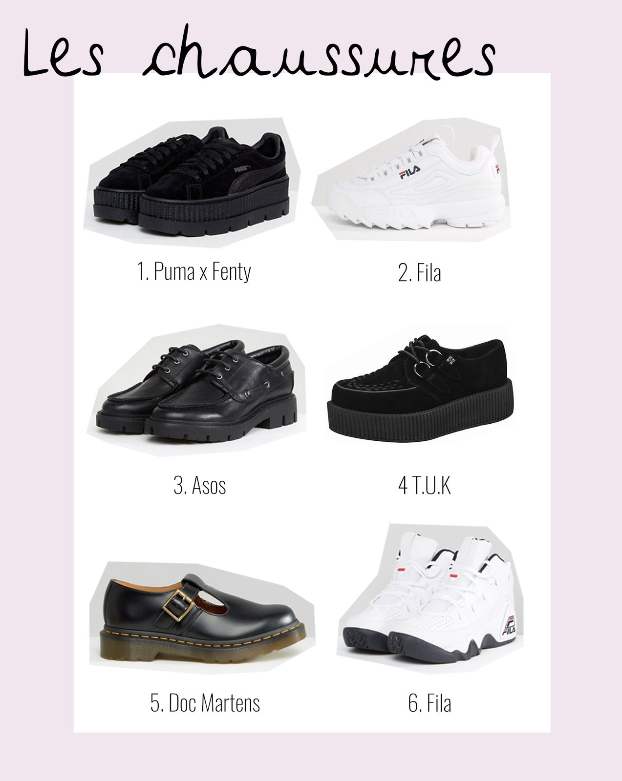 1. Creepers Puma x Fenty / 2. Fila Disruptor / 3. Chaussures noires à lacets Asos / 4. Creepers "viva mondo" T.U.K (parce que les miennes me manquent vraiment trop) / 5. Salomés Doc Martens / 6. Fila 95